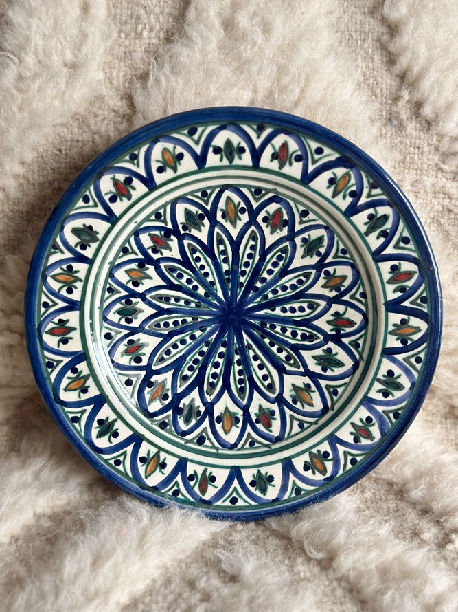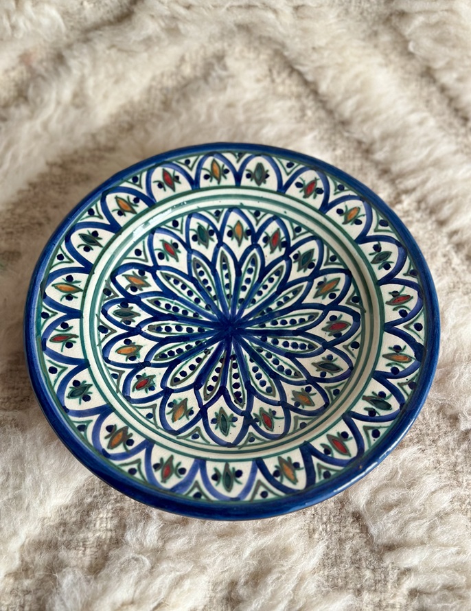 Talerz został ręcznie wykonany w Safi – marokańskiej stolicy ceramiki – z tradycyjnej czerwonej gliny. Każdy talerz ceramiczny jest ręcznie malowany przez lokalnych rzemieślników, którzy od pokoleń tworzą unikalne talerze marokańskie według dawnych technik.