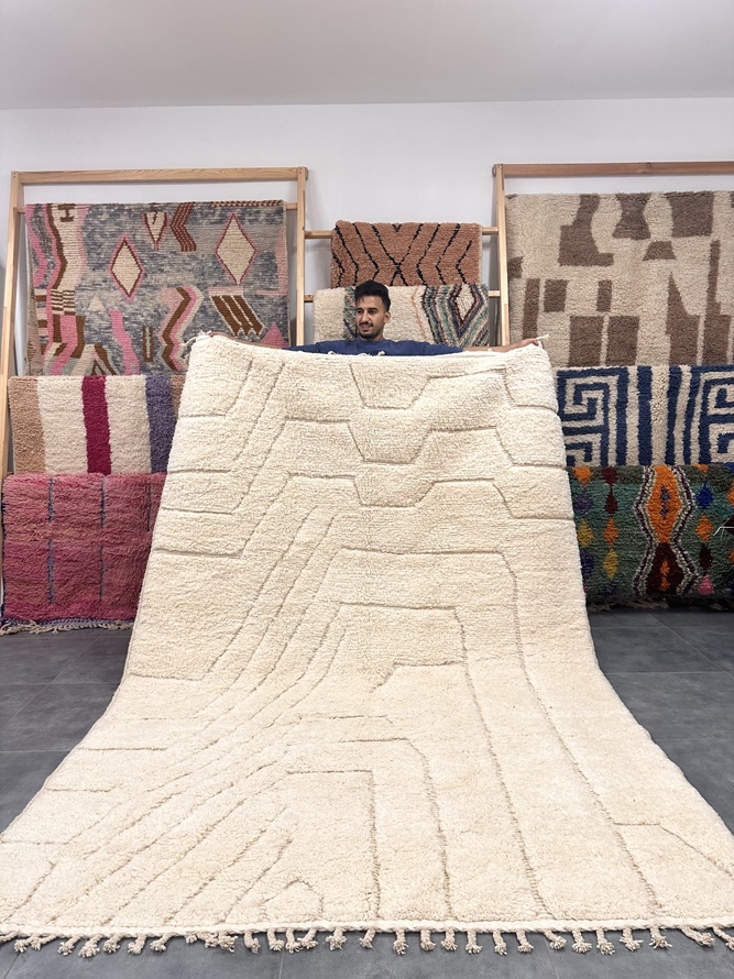 Dywan 200×300 cm ręcznie tkany marokański Beni Ourain Rfissa tkaczki Amazigh stworzyły w całości ręcznie, węzeł po węźle, na stojącym krośnie, przy użyciu najwyższej jakości wełny. Nasze produkty – dywany z Maroka mają duszę i serce włożone w ich powstanie. Dzięki swojej pasji i umiejętnościom, rękodzielniczki dywanów z Maroka przekazują nam nie tylko piękno, ale także historię i kulturę swojego kraju. Dywan Beni Ourain Kulshi w marokańskie wzory to więcej niż tylko dywan – to dzieło sztuki, które przynosi do wnętrza ciepło, charakter i niepowtarzalny styl marokańskiego rzemiosła.