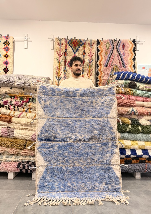 Ten wyjątkowy dywan marokanski to autentyczne dzieło rąk berberyjskich tkaczek z regionów gór Atlasu, tworzących w tradycji Amazigh. Dywan błękitny o wymiarach 1,6 × 1 metr to połączenie subtelnej kolorystyki, autentycznego rękodzieła i ponadczasowego designu. Ręcznie tkany przez marokańskich rzemieślników z naturalnej wełny, zachwyca miękkością, trwałością i delikatnymi marokańskimi wzorami, które nadają wnętrzu lekkości i harmonii.