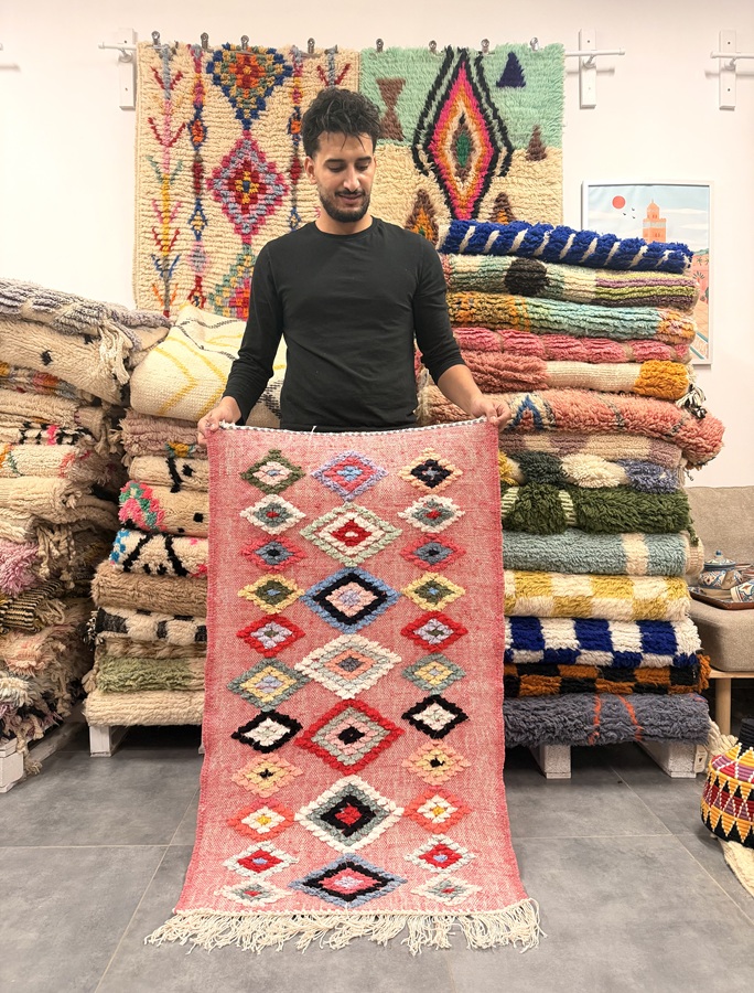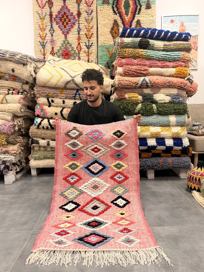 Ten dywan czerwony to autentyczne marokańskie rękodzieło, wykonane ręcznie przez lokalnych rzemieślników w Maroku. Tkany z naturalnej bawełny, zachwyca geometrycznymi wzorami inspirowanymi kulturą Berberów oraz ciepłą, energetyczną kolorystyką. Każdy egzemplarz jest unikalny i stanowi część bogatej tradycji, z której słyną dywany marokańskie.