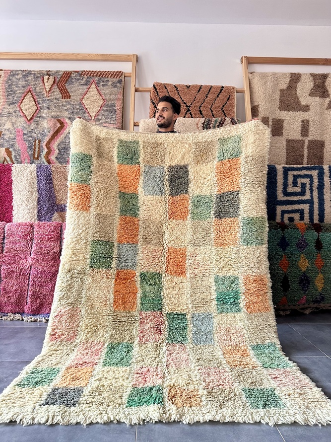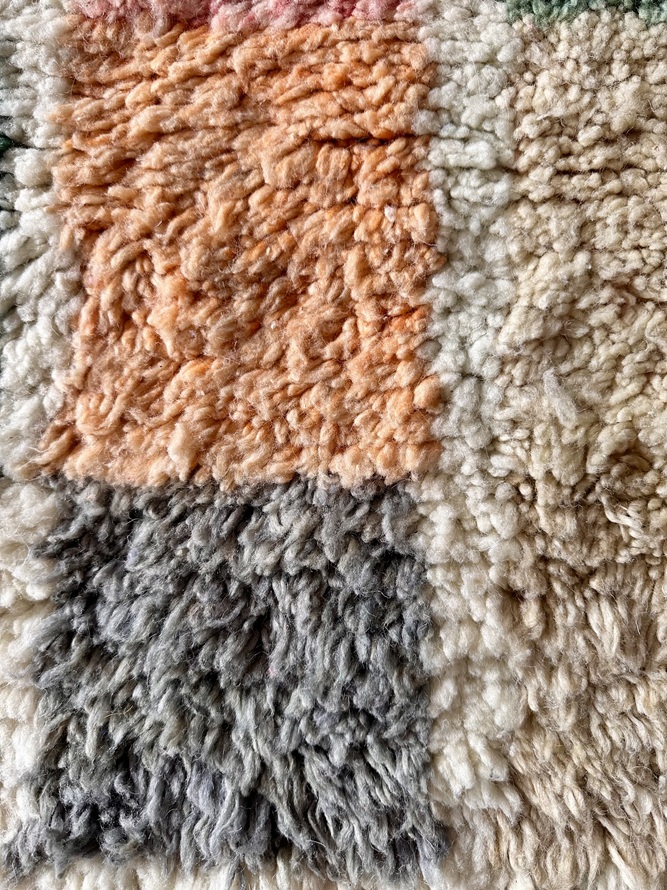 Dywan Azilal Jamil zachwyca pastelowymi kolorami – znajdziesz tu subtelne odcienie męty, brzoskwini, moreli, jasnej zieleni, szarości i delikatnego różu. Wszystko to ułożone w geometryczne kwadraty i pola, typowe dla tradycyjnych dywanów w marokańskie wzory. Jasna, kremowa baza podkreśla lekkość i świeżość całej kompozycji.