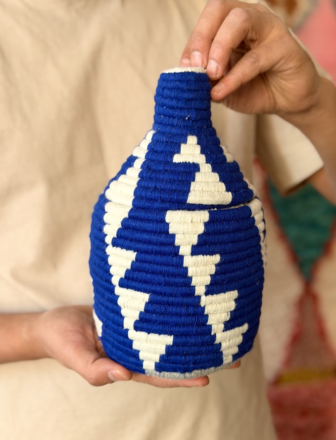Ten wyjątkowy koszyk dekoracyjny ze zdejmowaną pokrywką to połączenie tradycyjnego marokańskiego rzemiosła z nowoczesną estetyką. Ręcznie tkany z naturalnych liści palmowych i zdobiony miękką, barwioną wełną, zachwyca intensywnym kolorem i geometrycznym wzorem inspirowanym kulturą Amazigh.